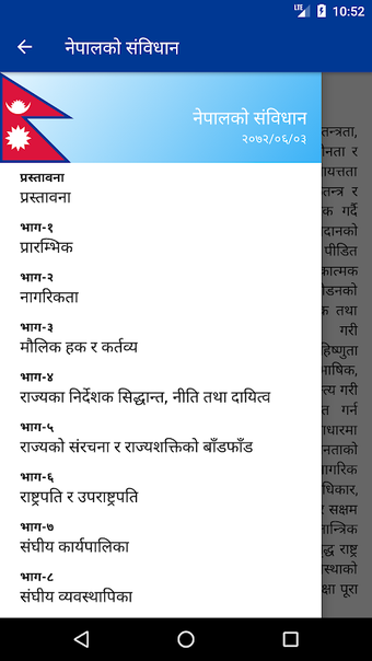 Konstitusi Nepal memiliki 9 bab dan 31 pasal. Ini adalah hukum tertinggi negara dan setiap katanya memiliki nilai yang sama dan suci.